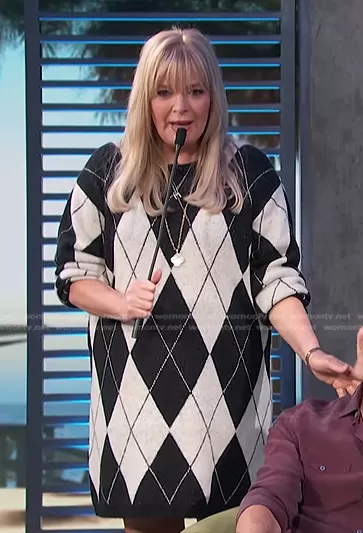 on Access Hollywood on NBC was spotted wearing this black argyle sweater dress on Access Daily on Sep 23 2022's episode. 's Dress is the Argyle Print Waistless Sweater Dress by Antonio Melani.