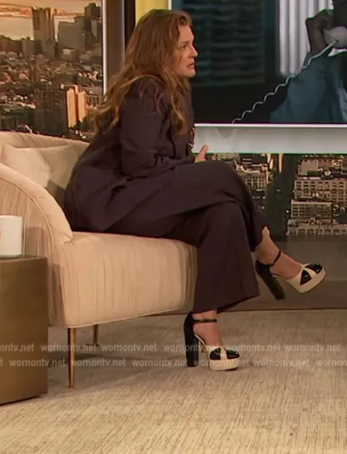 Drew Barrymore on The Drew Barrymore Show on CBS was spotted wearing this navy pinstripe blazer and satin top on The Drew Barrymore Show on Sep 23 2022's episode. Drew's Blazer is the Double-breasted pinstriped woven blazer by Victoria Beckham . Drew's Pants is the Pinstriped woven straight-leg pants by Victoria Beckham . Drew's Top is the Nupar Mixed Media Blouse by Weekend Max Mara . Drew's Shoes is the Two tone Mary Jane Heels by Celine . Drew's Earrings is the Twisted Folded Ribbon Large Post Earrings by Alexis Bittar.
