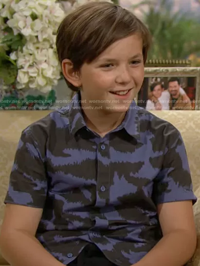 Douglas Forrester (played by Django Ferri) on The Bold and the Beautiful on CBS was spotted wearing this blue and black printed shirt on The Bold and the Beautiful on Sep 23 2022's episode. 's Shirt is the Abstract Camo Print Short Sleeve Cotton Button-Up Shirt by Treasure & Bond .