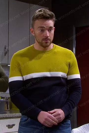 Will Horton (played by Chandler Massey) on Days of our Lives on Peacock was spotted wearing this yellow colorblock sweater on Days of our Lives on Sep 24 2022's episode. 's Sweater is the Spears Color Block Sweater by Ted Baker.