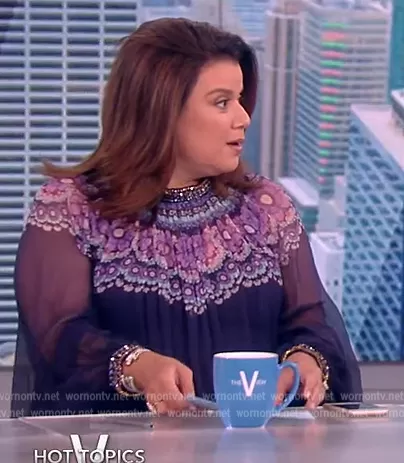 Ana Navarro on The View on ABC was spotted wearing this purple floral print sheer blouse on The View on Sep 26 2022's episode. Ana's Top is the Celestial Gemini Daisy chiffon blouse by Zimmermann.