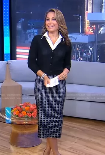 Ginger Zee on Good Morning America on ABC was spotted wearing this black knit pencil skirt on Good Morning America on Feb 19 2026's episode. Ginger's Skirt is the Atlassy Atlas Jacquard Skirt by Ted Baker.