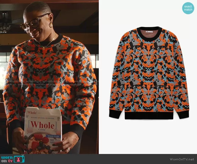Henrietta Wilson (played by Aisha Hinds) on 9-1-1 on ABC was spotted wearing this orange abstract print sweater on 9-1-1 on episode 'Crash & Learn' (6x02) in Sep 2022. Hen's Sweater is the Abstract Jacquard Sweater by Zara.