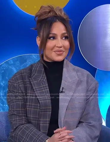 on Good Morning America on ABC was spotted wearing this grey plaid colorblock blazer on Good Morning America on Sep 27 2022's episode. 's Jacket is the Oversized Contrast Plaid Blazer by Something Navy.