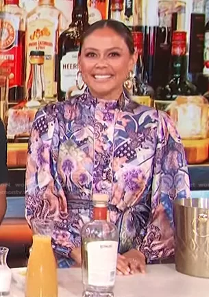 on Access Hollywood on NBC was spotted wearing this purple floral dress on Access Daily on Sep 27 2022's episode. 's Dress is the Celestial Printed Silk Mini Dress by Zimmermann.