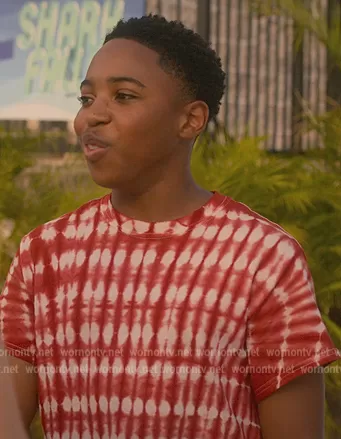 (played by ) on Cobra Kai on Netflix was spotted wearing this Red tie dye tee on Cobra Kai on episode 'Downward Spiral' (5x04) in Sep 2022. 's Shirt is the Batik All Cotton Ayumi Tee by Studio 189.