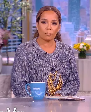 Sunny Hostin on The View on ABC was spotted wearing this blue chain embellished distressed sweater on The View on Sep 28 2022's episode. Sunny's Sweater is the Embellished distressed mélange hemp-blend sweater by Loewe.