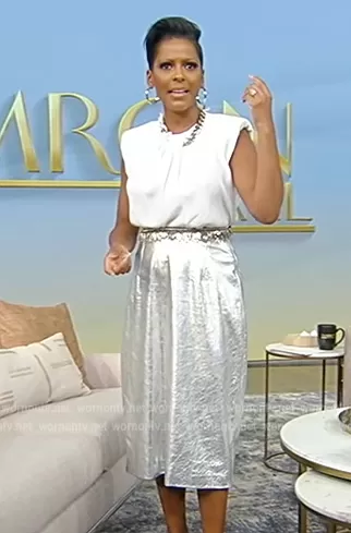 Tamron Hall on Tamron Hall Show on ABC was spotted wearing this white chain embellished top and skirt on Tamron Hall Show on Sep 28 2022's episode. Tamron's Top is the Falabella Chain Detail Blouse by Stella McCartney . Tamron's Skirt is the Metallic Lambskin Midi-Skirt by Balenciaga.