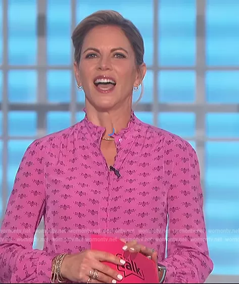 Natalie Morales on The Talk on CBS was spotted wearing this pink printed blouse on The Talk on Sep 28 2022's episode. Natalie's Top is the Mintee Floral Ruffle Blouse by Joie.