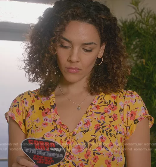 (played by Vanessa Rubio) on Cobra Kai on Netflix was spotted wearing this yellow floral print dress on Cobra Kai on episode 'Bad Eggs' (5x07) in Sep 2022. 's Dress is the Jessica Simpson Womens Sade Printed Mini Wrap Dress by Jessica Simpson.