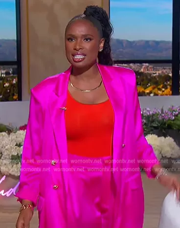 Jennifer Hudson on The Jennifer Hudson Show on FOX was spotted wearing this pink satin double breasted blazer on The Jennifer Hudson Show on Sep 29 2022's episode. Jennifer's Blazer is the Pandora Silk Blazer by Retrofete . Jennifer's Pants is the Rocky Silk Pants by Retrofete.
