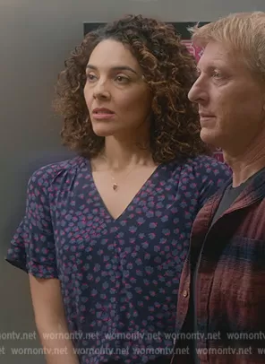 (played by Vanessa Rubio) on Cobra Kai on Netflix was spotted wearing this blue floral print v-neck top on Cobra Kai on episode 'Survivors' (5x09) in Sep 2022. 's Top is the Aster Floral Blouse by Rebecca Taylor.