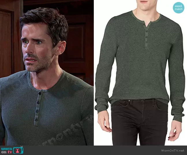 Shawn-Douglas Brady (played by Brandon Beemer) on Days of our Lives on Peacock was spotted wearing this green waffle texture henley on Days of our Lives on Jun 12 2023's episode. 's Shirt is the Otis Ls Space Dye Waffle Henley by John Varvatos.