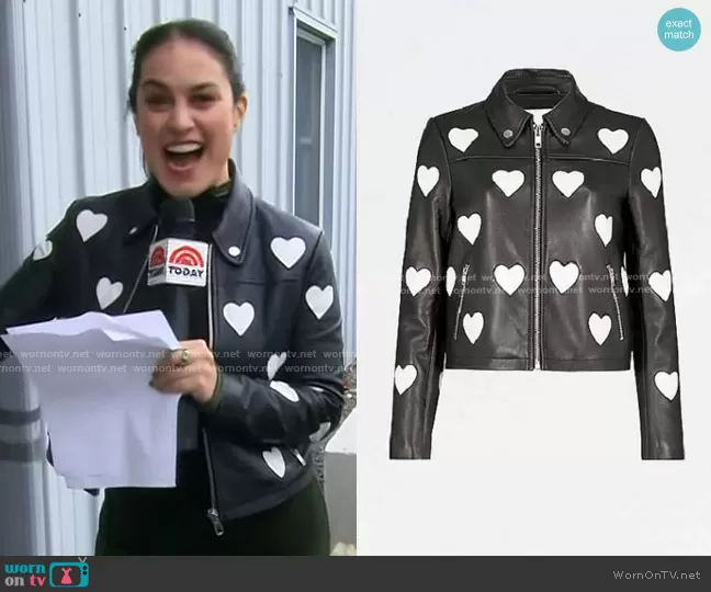 Donna Farizan on Today on NBC was spotted wearing this black heart leather jacket on Today on Oct 24 2022's episode. Donna's Jacket is the Heart Detail Leather Jacket by Maje.