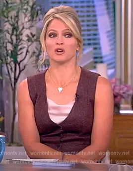Sara Haines on The View on ABC was spotted wearing this metallic vest and pants on The View on Sep 30 2022's episode. Sara's Vest is the Zelos Strech Wool & Silk Tweed Vest by Gabriela Hearst . Sara's Pants is the Rhien Sparkle Wool & Silk Blend Wide Leg Pants by Gabriela Hearst.
