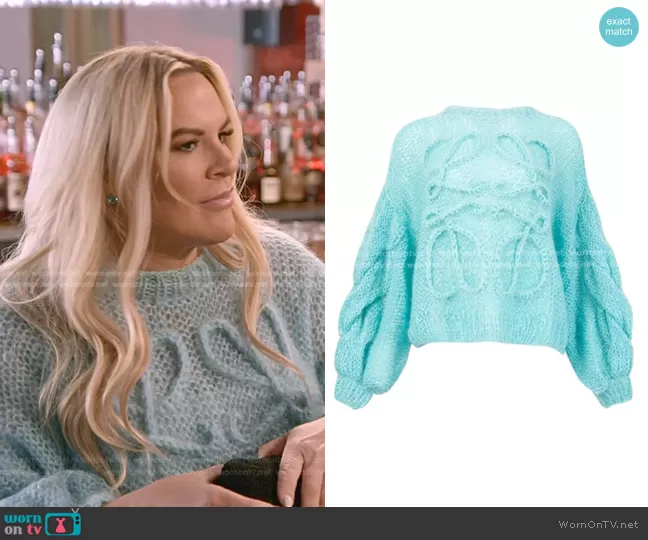 Heather Gay on The Real Housewives of Salt Lake City on Bravo was spotted wearing this blue knit sweater on The Real Housewives of Salt Lake City on episode 'Revenge Marks the Spot' (3x01) in Oct 2022. Heather's Sweater is the Puff Sleeve Mohair Sweater by Loewe . Heather's Bag is the Diana Small Tote Bag by Gucci.