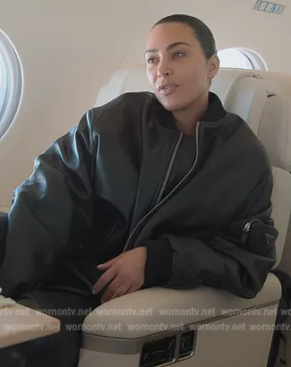 Kim Kardashian (played by Kim Kardashian) on The Kardashians on Hulu was spotted wearing this black leather jacket on The Kardashians on episode 'Prada You!' (2x02) in Oct 2022. Kim's Jacket is the Oversized high-shine bomber jacket by Prada . Kim's Gloves is the Re-Nylon and Napa Leather Gloves by Prada . Kim's Sunglasses is the Prada Runway sunglasses by Prada.