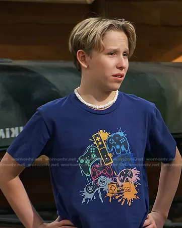 Jake (played by Luke Busey) on Bunkd on Disney was spotted wearing this blue video game controller tee on Bunkd on episode 'Bunkhouse of Horror' (6x09) in Sep 2022.