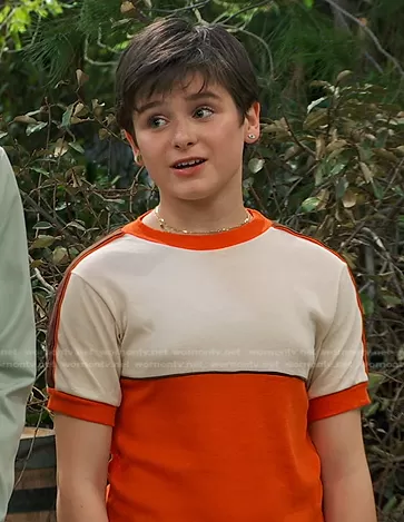 Winnie Webber (played by Shiloh Verrico) on Bunkd on Disney was spotted wearing this orange colorblock tee on Bunkd on episode 'Bunkhouse of Horror' (6x09) in Sep 2022. Winnie's Top is the Vintage Colorblock T Shirt by Urban Outfitters.