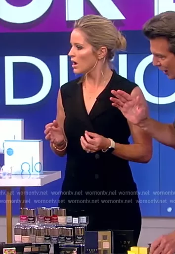Sara Haines on The View on ABC was spotted wearing this black double breasted dress on The View on Oct 03 2022's episode. Sara's Dress is the Milena Sleeveless Knit Tuxedo Dress by Reiss.