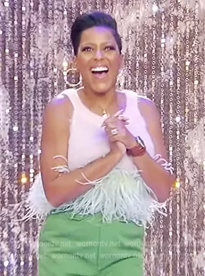 Tamron Hall on Tamron Hall Show on ABC was spotted wearing this feather trim top on Tamron Hall Show on Oct 03 2022's episode. Tamron's Top is the Cropped feather-trimmed mohair-blend top by Saint Laurent.