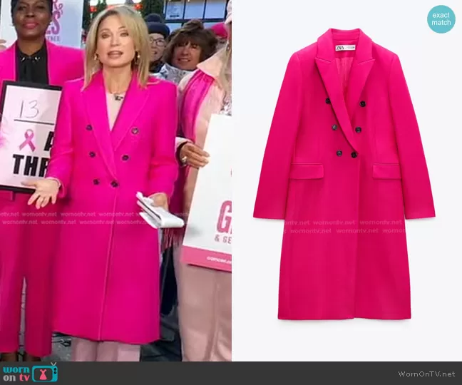 Amy Robach on Good Morning America on ABC was spotted wearing this pink double breasted coat on Good Morning America on Oct 03 2022's episode. Amy's Coat is the Tailored Double Breasted Coat by Zara.