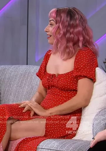 on The Kelly Clarkson Show on NBC was spotted wearing this red polka dot print dress on The Kelly Clarkson Show on Oct 03 2022's episode. 's Dress is the Teyana Polka Dot Midi Dress by Reformation.