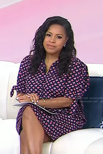 Sheinelle Jones on Today on NBC was spotted wearing this navy and pink floral puff sleeve dress on Today on Oct 04 2022's episode. Sheinelle's Dress is the Floral Printed Puff Sleeve Dress by Trina Turk.