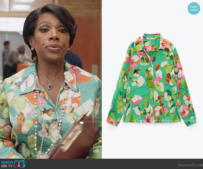 Barbara Howard (played by Sheryl Lee Ralph) on Abbott Elementary on ABC was spotted wearing this green floral print blouse on Abbott Elementary on episode 'Story Samurai' (2x02) in Oct 2022. Barbara's Top is the Floral Satin Blouse by Zara.