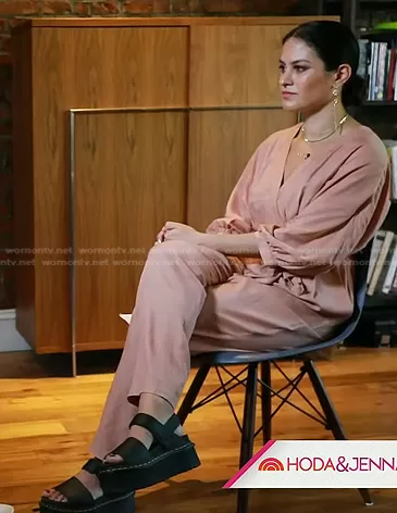 Donna Farizan on Today on NBC was spotted wearing this pink jumpsuit and platform sandals on Today on Oct 04 2022's episode. Donna's Shoes is the Voss Quad Hydro Leather Platform Sandal by Dr. Martens.