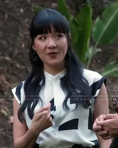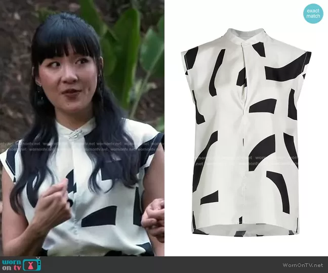 on Good Morning America on ABC was spotted wearing this white printed top on Good Morning America on Oct 04 2022's episode. 's Top is the Printed Silk Satin Sleeveless Blouse by 3.1 Phillip Lim.