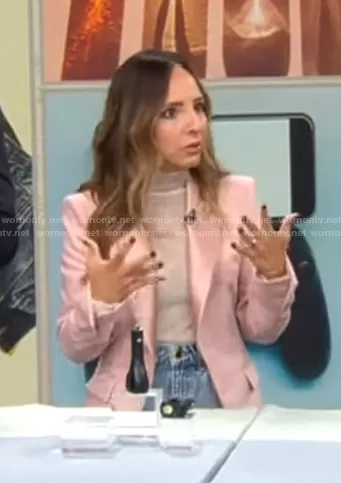 on CBS Mornings on CBS was spotted wearing this blush pink cropped blazer on CBS Mornings on Oct 04 2022's episode. 's Jacket is the Cropped Tuxedo Jacket by Zara.