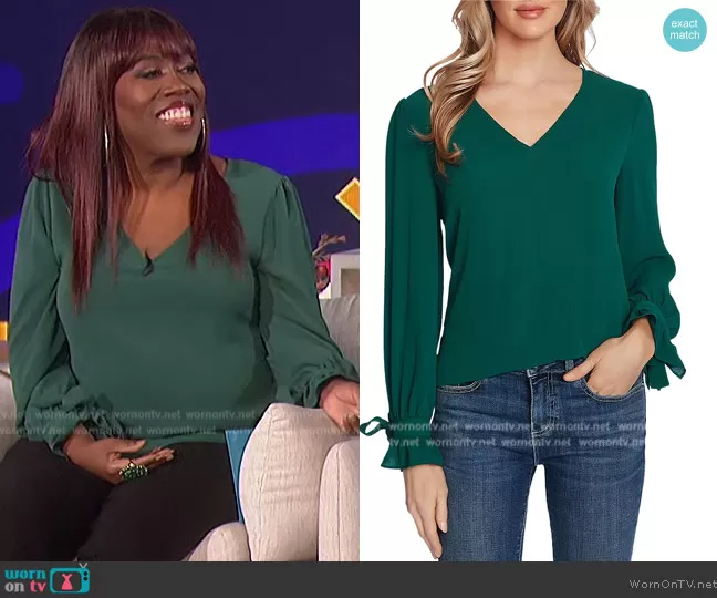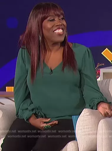 Sheryl Underwood on The Talk on CBS was spotted wearing this green tie cuff blouse on The Talk on Oct 04 2022's episode. Sheryl's Top is the Tie Sleeve Blouse by Cece.