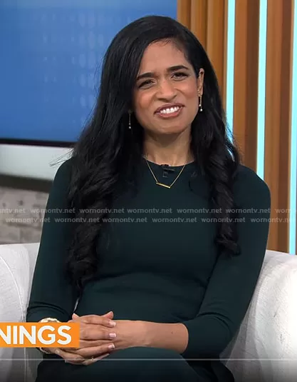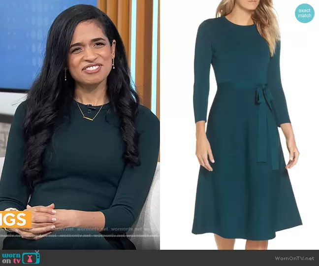on CBS Mornings on CBS was spotted wearing this green dress on CBS Mornings on Oct 05 2022's episode. 's Dress is the Fit & Flare Sweater Dress in Spruce by Eliza J.