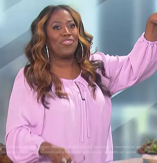 Sheryl Underwood on The Talk on CBS was spotted wearing this lavender tie neck blouse on The Talk on Oct 05 2022's episode. Sheryl's Top is the Tie Ballet Neck Blouse by Sanctuary.