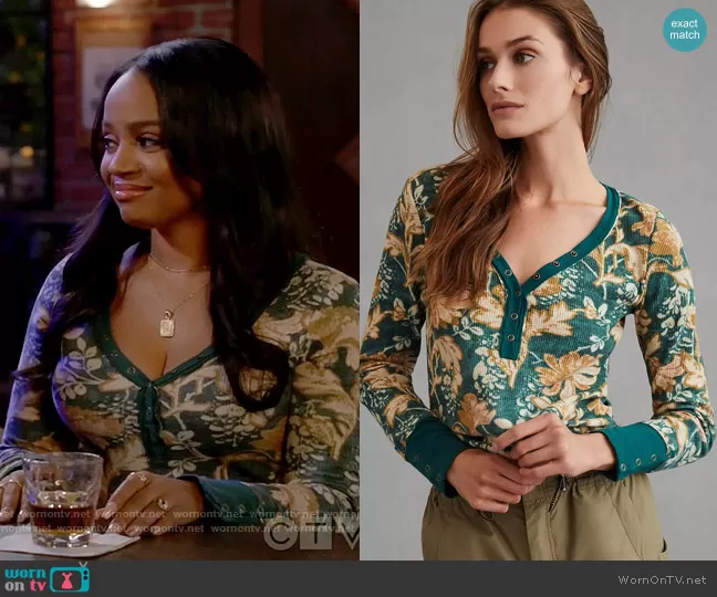 Randi (played by Kyla Pratt) on Call Me Kat on Fox was spotted wearing this teal green floral henley top on Call Me Kat on episode 'Call Me Skeeter Juice' (3x02) in Oct 2022. Randi's Top is the Waffle Henley Top in Green Motif by Pilcro at Anthropologie.