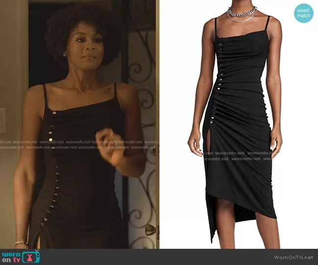 Jax Stewart (played by Emayatzy Corinealdi) on Reasonable Doubt on Hulu was spotted wearing this black button ruched dress on Reasonable Doubt on episode 'Family Feud' (1x02) in Sep 2022. Jax's Dress is the Draped Jersey Dress by Paco Rabanne.
