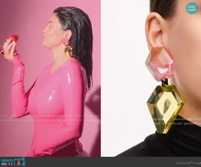 Kylie Jenner (played by Kylie Jenner) on The Kardashians on Hulu was spotted wearing this Kylie crystal statement earrings on The Kardashians on episode 'Life Can Change On A Dime' (2x03) in Oct 2022. Kylie's Earrings is the Earring in Pink and Yellow Polyester.