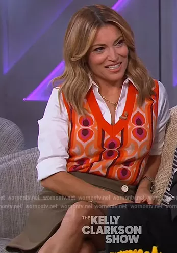 on The Kelly Clarkson Show on NBC was spotted wearing this printed vest and skirt on The Kelly Clarkson Show on Oct 07 2022's episode. 's Vest is the Vera Jacquard Sweater Vest by Maeve . 's Skirt is the Julieta Wool A-Line Skirt by Sandro.