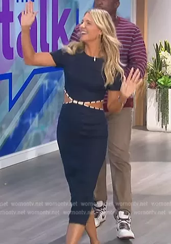 Amanda Kloots on The Talk on CBS was spotted wearing this navy contrast cutout dress on The Talk on Oct 07 2022's episode. Amanda's Dress is the Matteo Dress in Navy by Staud.