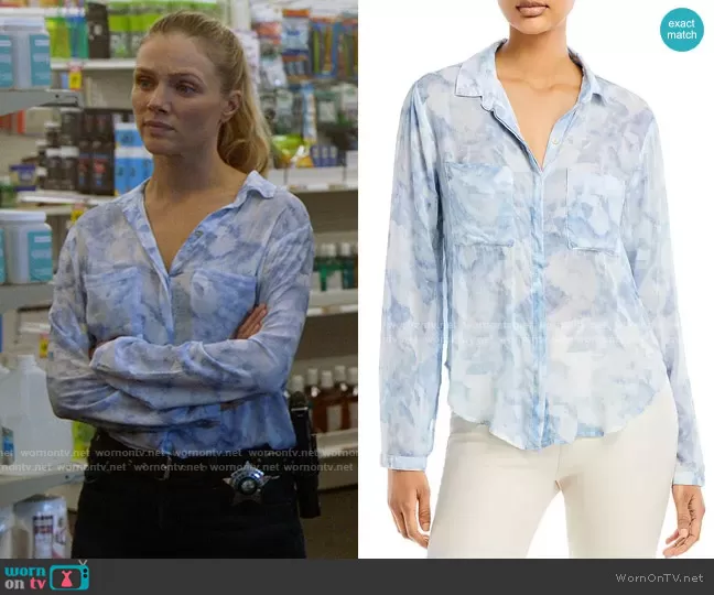 Hailey Upton (played by Tracy Spiridakos) on Chicago PD on NBC was spotted wearing this blue watercolor print button up shirt on Chicago PD on episode 'A Good Man' (10x03) in Oct 2022. Hailey's Top is the Watercolor Print Button Down Blouse by Bella Dahl.