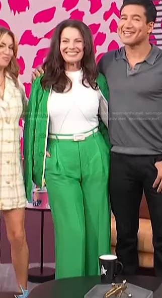 on Access Hollywood on NBC was spotted wearing this green cable knit cardigan and pants on Access Daily on Oct 06 2022's episode. 's Sweater is the Salon 03 Engineered Technoskin Sweater by Bottega Veneta . 's Sweater is the Check Knit Cardigan by Bottega Veneta . 's Pants is the Salon 03 Pleated Wide-Leg Pants by Bottega Veneta.