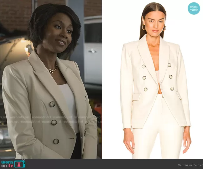 Jax Stewart (played by Emayatzy Corinealdi) on Reasonable Doubt on Hulu was spotted wearing this white double breasted blazer on Reasonable Doubt on episode '99 Problems' (1x03) in Oct 2022. Jax's Blazer is the Miller Dickey Jacket by Veronica Beard.