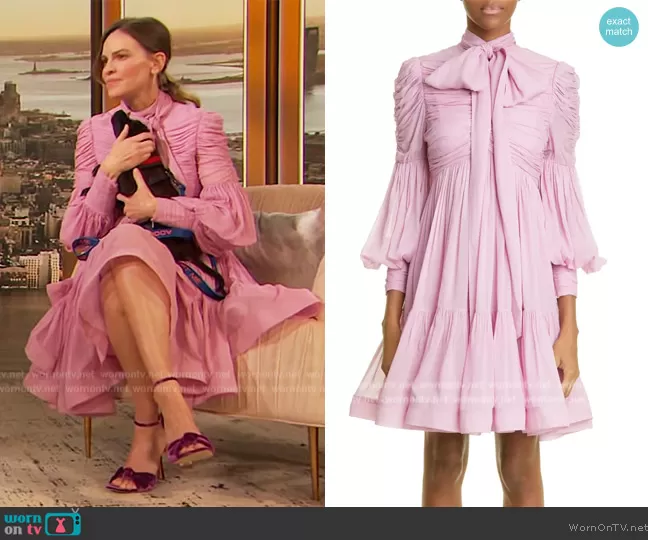 on The Drew Barrymore Show on CBS was spotted wearing this pink ruched mini dress on The Drew Barrymore Show on Oct 10 2022's episode. 's Dress is the Celestial ruched minidress by Zimmermann.