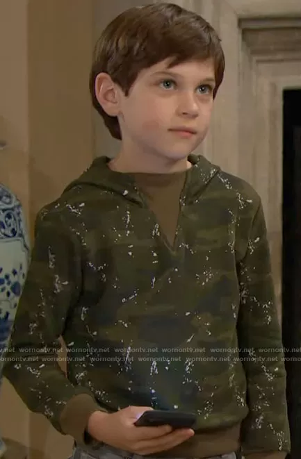 Douglas Forrester (played by Henry Joseph Samiri) on The Bold and the Beautiful on CBS was spotted wearing this camo print hoodie on The Bold and the Beautiful on Oct 10 2022's episode. 's Sweatshirt is the Splatter Print Hoodie by Joe's Jeans .