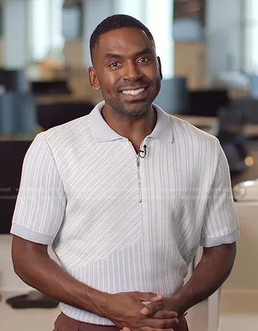 Justin Sylvester on E! News on E! was spotted wearing this white striped quarter zip polo shirt on E! News Nightly Pop on Oct 08 2022's episode. Justin's Shirt is the Stripe Short Sleeve Quarter Zip Polo Sweater by Topman.