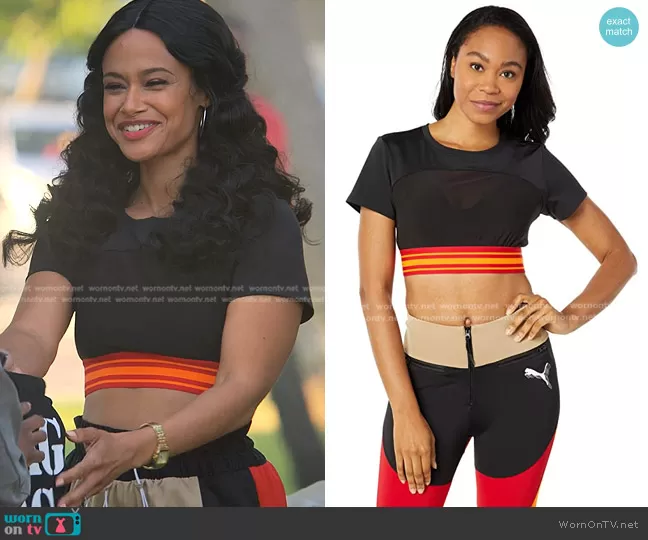 Shanelle Tucker (played by Shannon Kane) on Reasonable Doubt on Hulu was spotted wearing this black cropped striped trim tee on Reasonable Doubt on episode 'Bringing a Gun to a Fist Fight' (1x04) in Oct 2022. Shanelle's Top is the High Court Ora Mesh Top by Puma.
