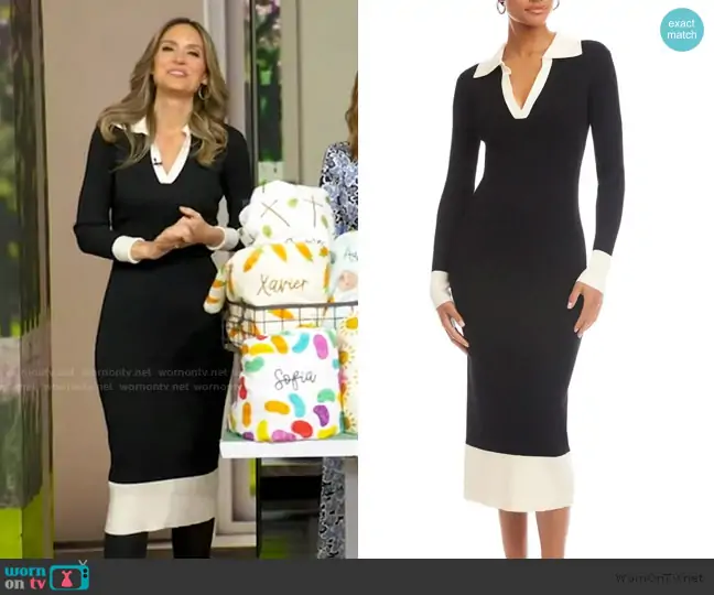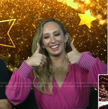 on Good Morning America on ABC was spotted wearing this pink ribbed cuff dress on Good Morning America on Oct 11 2022's episode. 's Dress is the Lover Man Cocktail Dress with Satin Panels in Berry by Zhivago.