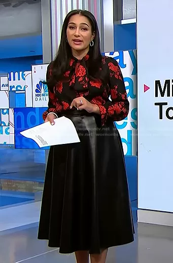 Morgan Radford on NBC News Daily on NBC was spotted wearing this black and red print tie neck blouse on NBC News Daily on Sep 16 2024's episode. Morgan's Top is the Floral Tie-Neck Long-Sleeve Silk Blouse by Tory Burch.