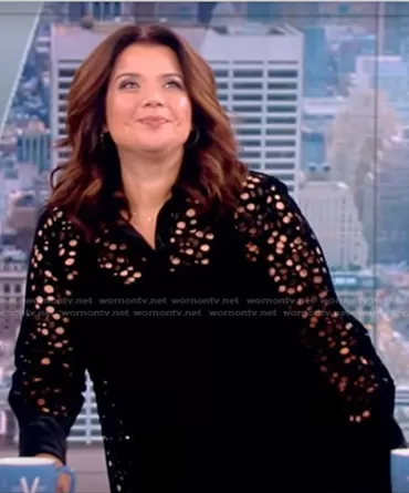 Ana Navarro on The View on ABC was spotted wearing this black cutout velvet blouse on The View on Oct 11 2022's episode. Ana's Top is the Butterfly Wing Cutout Velvet Button-Up Shirt by Akris Punto.